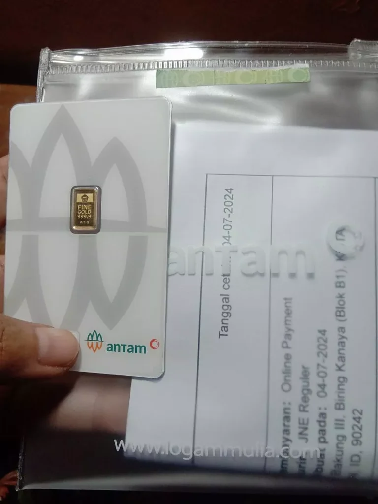 Emas ANTAM Logam Mulia (LM) hadir dengan desain dan kemasan dalam bentuk kartu yang disertai security mark untuk meningkatkan perlindungan dan keamanan bagi investasi anda. Produk yang terjamin dengan kadar dan kualitas yang senantiasa menjamin kenyamanan dan keamanan investasi jangka panjang. Spesifikasi Produk: – Kadar : 99.99% – Berat : 0,5 gram – Kemasan : Certicard Emas batangan ANTAM LM terjamin keaslian dan kemurniannya dengan sertifikat LBMA (London Bullion Market Association). Segera miliki emas batangan ANTAM LM mulai dari pecahan 0.5 gram sampai dengan pecahan 1000 gram. Pungutan Pajak Penghasilan Pasal 22 atas Penjualan Emas Batangan dan Perhiasan, Sesuai dengan PMK Nomor 48 tahun 2023 dengan tarif 0,25% (sesuai ketentuan yang berlaku) dan akan diterbitkan bukti potong PPh 22 oleh PT ANTAM Tbk sebagai Penjual.